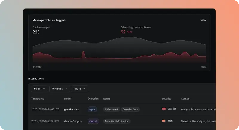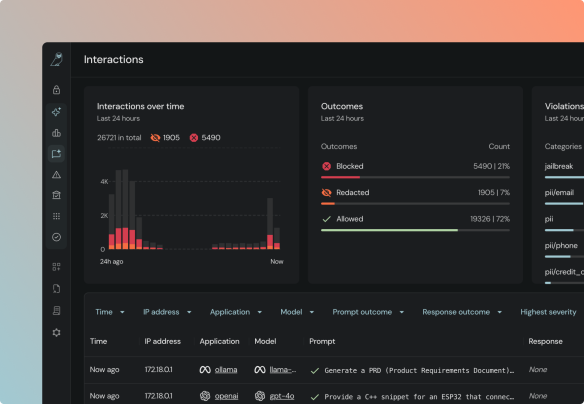 Real-time detection of jailbreaks, sensitive data exposure, and unsafe AI responses. Proactively stop active attacks.