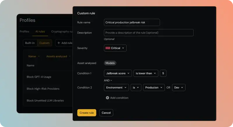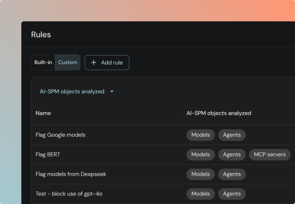 Build custom rules to enforce policy and governance across your AI assets.