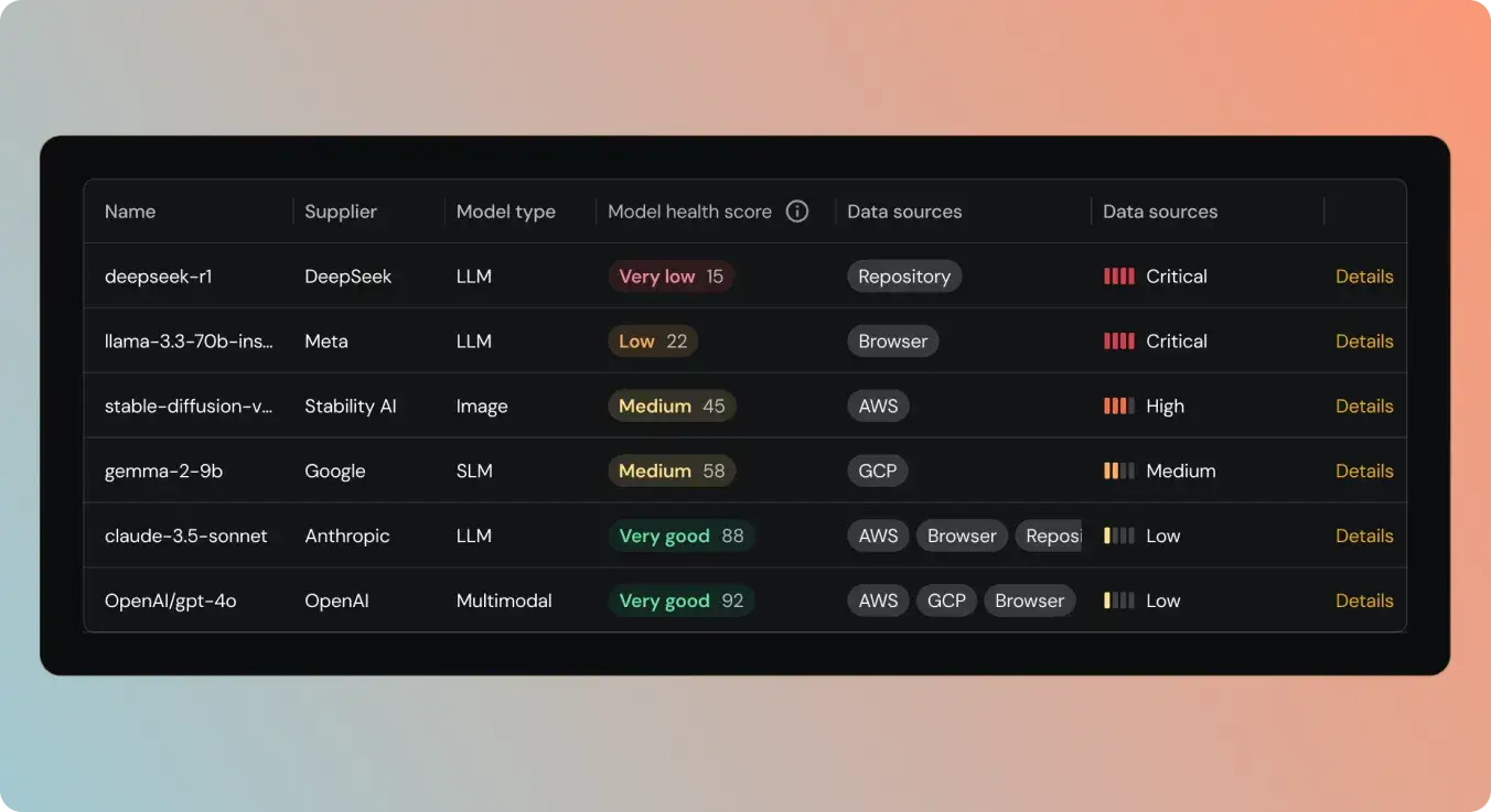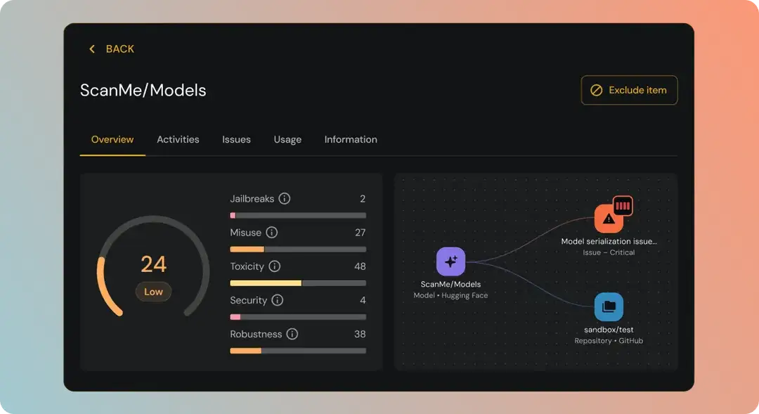Deep context of what your AI risk is, where it lives, and how it impacts your organization. Detect threats like model serialization attacks, instantly separating safe models from liabilities.